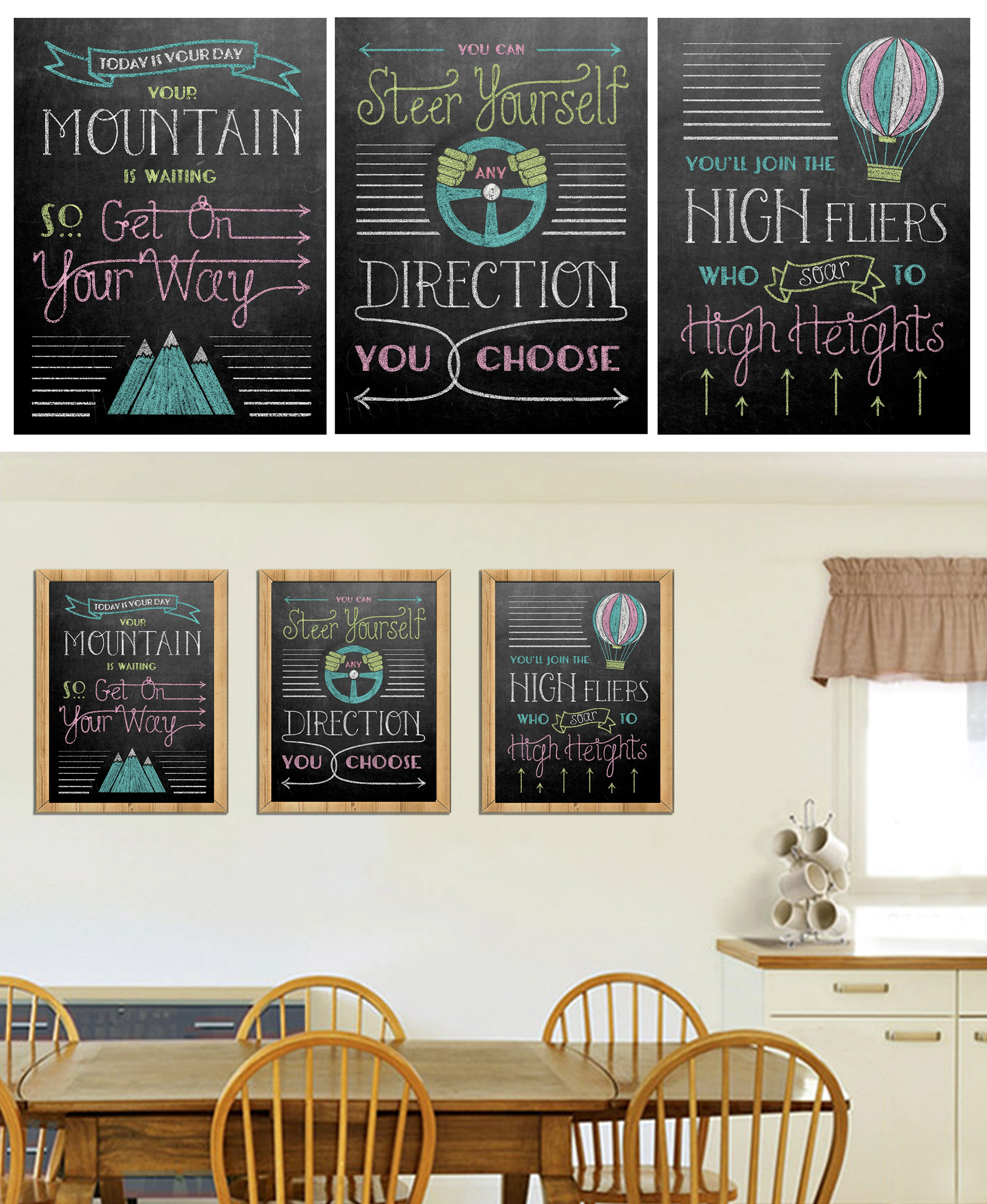 Typographical, hand lettered chalk posters with quotes from Dr. Seuss' "Oh, The Places You'll Go."