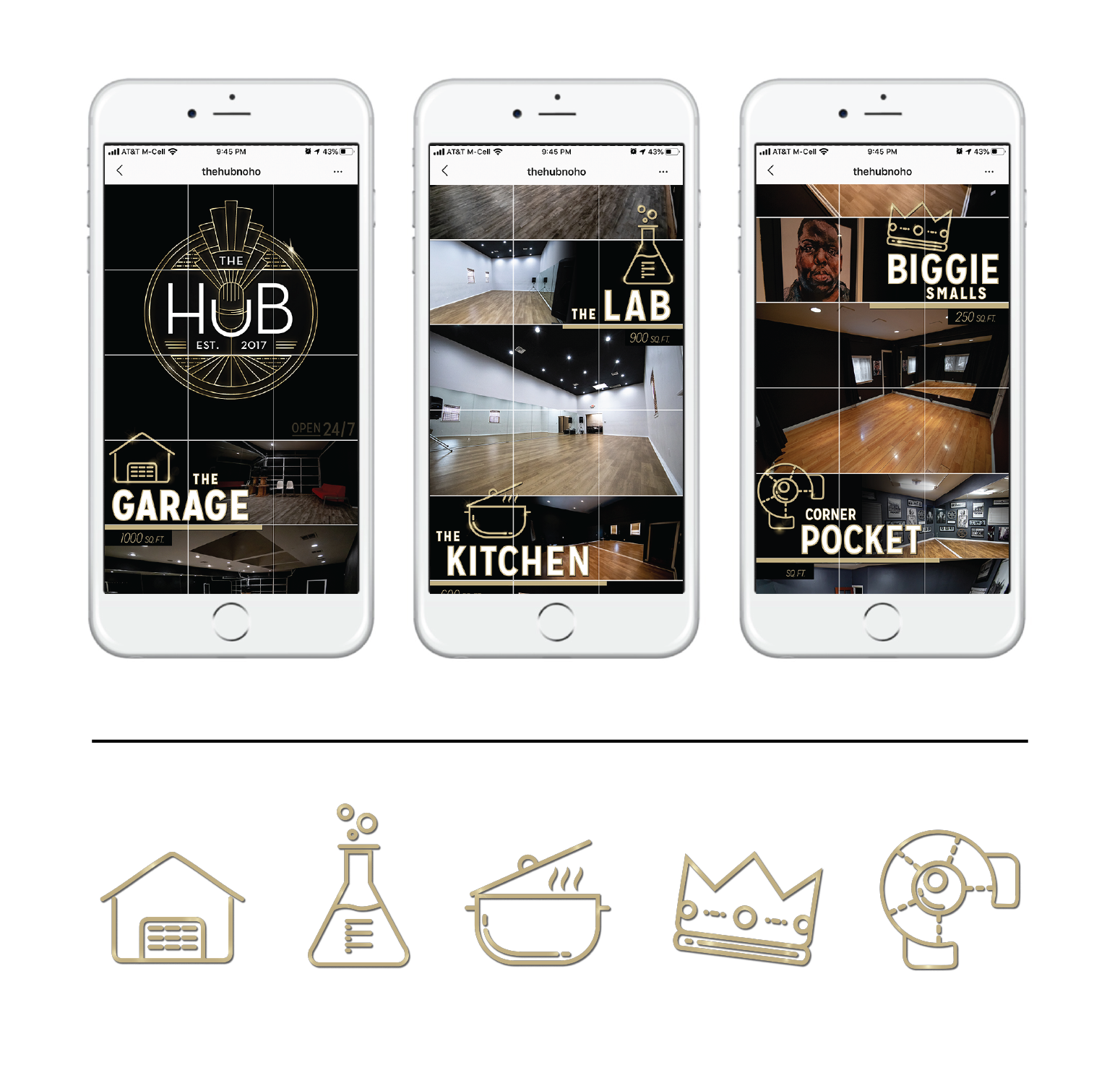 Instagram profile layout and icon design for The Hub Noho - a dance studio in Los Angeles that provides space rentals to show pictures of each room available.